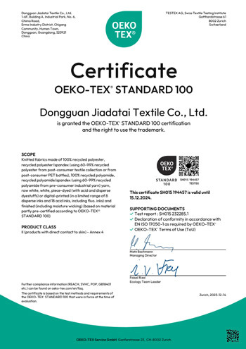 International markets are increasingly stringent in reviewing the “green credentials” of products. We are committed to building an end-to-end environmental compliance system. On the raw material front, we provide traceable recycled material options that comply with the Global Recycled Standard (GRS) certification; regarding safety, we insist that all materials pass safety certifications like OEKO-TEX Standard 100.